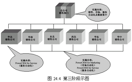 這個(gè)階段有三個(gè)小階段,即營(yíng)銷(xiāo)自動(dòng)化向其他機(jī)構(gòu)推廣,服務(wù)自動(dòng)化應(yīng)用開(kāi)始在華北公司實(shí)施并向其他機(jī)構(gòu)推廣,公司總部的數(shù)據(jù)集中并同步實(shí)施CRM的各種業(yè)務(wù)功能。
