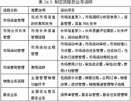 根據(jù)CRM軟件的總體目標(biāo),項目組詳細(xì)審核每個業(yè)務(wù)的流程,并按照流程對軟件進(jìn)行定制。所制定的流程包括三大業(yè)務(wù)領(lǐng)域的業(yè)務(wù),見表24.3。