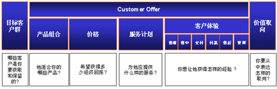 造成這樣的結(jié)果, 關(guān)鍵在于僅僅用產(chǎn)品或服務(wù), 無法表達出客戶對企業(yè)完整的價值取向. 我們還需要更豐富的管理理念來表達出企業(yè)對客戶所有的價值提供. 這一概念其實早已由埃森哲提出, 我們稱之為”Customer Offer”. 其內(nèi)涵在國內(nèi)的實際項目中已經(jīng)得到實踐的檢驗, 并取得良好的效果(該項目為某國內(nèi)領(lǐng)先的電信運營企業(yè)的CRM項目, 于2003年底完成).