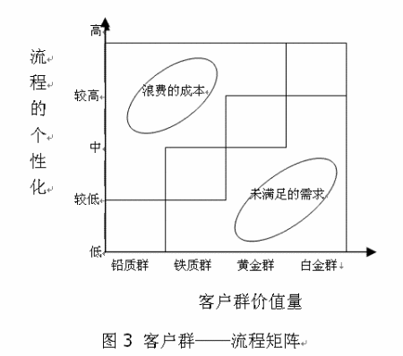 圖中橫軸代表客戶群價值量,從“鉛質(zhì)客戶群”到“白金客戶群”過渡?v軸表示業(yè)務(wù)流程的個性化程度(包括流程的靈活性、流程的活動承擔(dān)者的設(shè)置、流程中的活動要素的配置等),是一種與客戶群價值量相對應(yīng)的供應(yīng)方面的流程特征。左上方的橢圓圈表示對價值量低的鉛質(zhì)群、鐵質(zhì)群客戶設(shè)置了個性化較高的流程,這表明企業(yè)資源配置不合理,因而有些資源的投入大于產(chǎn)出,從而產(chǎn)生過高的成本。右下方的橢圓圈則代表了未被滿足的需求。用很標(biāo)準(zhǔn)化的、缺乏人情味的流程向高價值的黃金群客戶、白金群客戶提供產(chǎn)品和服務(wù),將難以讓這些客戶滿意,從而導(dǎo)致高價值客戶的流失。圖的中間部分,四個矩形框的對角線位置則代表了客戶群價值和流程個性化恰當(dāng)?shù)钠ヅ。因此,企業(yè)可在四個矩形框的各自兩條對角線相交部分設(shè)置“白金客戶群流程、黃金客戶群流程、鐵質(zhì)客戶群流程、鉛質(zhì)客戶群流程”這四類流程,以此找到客戶群——由資源創(chuàng)造的產(chǎn)品和服務(wù)——流程群的最佳匹配。從圖中也可看出,鉛質(zhì)客戶群流程的標(biāo)準(zhǔn)化程度最高,通常不用提供特殊的個性化的服務(wù)及產(chǎn)品。白金群客戶流程的定制化則最高,企業(yè)需要為其量身打造流程。顯然這兩個流程的資源分配存在極大的差異。