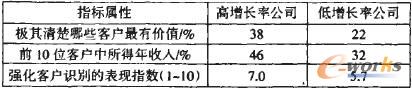 對(duì)《財(cái)富》雜志排名前l(fā)000位公司的200位經(jīng)理調(diào)查后得出結(jié)論,企業(yè)增長(zhǎng)性與清楚的識(shí)別客戶有明顯的聯(lián)系(見表1)。該表反映了高增長(zhǎng)率的企業(yè)比低增長(zhǎng)率的企業(yè)更加懂得客戶識(shí)別的重要性,并運(yùn)用技巧來強(qiáng)化核心客戶為企業(yè)創(chuàng)造更多價(jià)值。