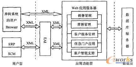 包括ERP、SCM等其他企業(yè)應(yīng)用在內(nèi)的所有的系統(tǒng)用戶與應(yīng)用功能層的數(shù)據(jù)交換均通過(guò)XMI數(shù)據(jù)進(jìn)行傳輸,從而大大減小了各種企業(yè)應(yīng)用系統(tǒng)間的通信阻力,為EAI提供了良好的通信平臺(tái)。Web用戶的客戶端只是“瘦小的”瀏覽器日_數(shù)量不受限制,不需要安裝專門的軟件,這使得凡可以接入Internet的用戶都可以方便、靈活地使用系統(tǒng),大大提升了系統(tǒng)用戶間溝通、協(xié)作的效率。此外,由于CRM應(yīng)用系統(tǒng)是在中央服務(wù)器上實(shí)施和維護(hù)的,對(duì)客戶端的要求遠(yuǎn)沒(méi)有C/S結(jié)構(gòu)那么高,集中的軟件實(shí)施和維護(hù)大大節(jié)約了企業(yè)的運(yùn)行成本和維護(hù)費(fèi)用。圖1描述的是筆者所要闡述的適應(yīng)網(wǎng)絡(luò)環(huán)境的基于Web的系統(tǒng)平臺(tái)架構(gòu),這并不意味著CRM應(yīng)用系統(tǒng)完全以這種方式運(yùn)行,事實(shí)上用戶接入CRM系統(tǒng)的方式是多種多樣的,系統(tǒng)還應(yīng)該提供電話、傳真、無(wú)線接入等多種接入接口。