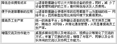 語音融合除了上面表格中所列的種種優(yōu)勢外,還能夠提供以前傳統(tǒng)通信平臺不具有的一些新的應用。
