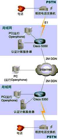 組成這個(gè)IP電話(huà)的網(wǎng)絡(luò)系統(tǒng)由處于兩個(gè)不同國(guó)家的區(qū)域組成(見(jiàn)附圖1網(wǎng)絡(luò)拓?fù)浣Y(jié)構(gòu)),每個(gè)區(qū)域都采用了一臺(tái)Cisco 5350路由器(以下簡(jiǎn)稱(chēng)5350)作為網(wǎng)絡(luò)的核心,這臺(tái)5350路由器具有兩個(gè)WAN口和兩個(gè)以太網(wǎng)口,能夠直接連接到本地的局域網(wǎng)和DDN基帶調(diào)制解調(diào)器。和普通電話(huà)網(wǎng)絡(luò)(PSTN)相連接則是通過(guò)添加一個(gè)E1接口卡4PRI和一個(gè)IP語(yǔ)音數(shù)據(jù)處理單元NP60,來(lái)實(shí)現(xiàn)E1(30條ISDN的B信道)和路由器相連接,實(shí)時(shí)地對(duì)語(yǔ)音數(shù)據(jù)進(jìn)行H.323壓縮編碼。