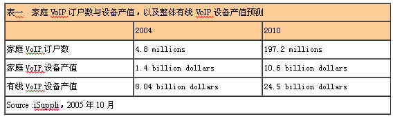 最近iSuppli更進(jìn)一步指出,推動(dòng)VoIP設(shè)備增長(zhǎng)的主要?jiǎng)恿碓词莵碜杂诩彝ビ脩。根?jù)其預(yù)測(cè),2004年時(shí)全球有480萬用戶,至2010年時(shí)將增長(zhǎng)至1.97億家庭用戶,增長(zhǎng)40倍以上。
