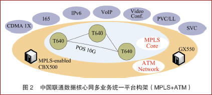 中國(guó)聯(lián)通IP電話網(wǎng)的承載網(wǎng)分為核心層和區(qū)域?qū)觾杉?jí)結(jié)構(gòu),核心層由北京、上海、廣州、沈陽(yáng)、武漢、西安和成都7個(gè)大區(qū)節(jié)點(diǎn)組成;區(qū)域?qū)影锤鞣止緟^(qū)域分布情況,劃分為22個(gè)區(qū)域。建網(wǎng)初期,承載網(wǎng)采用ATM+IP/VPN組成IP電話專用傳輸網(wǎng),確保IP承載層的QoS,網(wǎng)絡(luò)性能符合聯(lián)通測(cè)試指標(biāo)。下一階段,中國(guó)聯(lián)通數(shù)據(jù)核心網(wǎng)的技術(shù)演進(jìn)路線方向如圖2所示。網(wǎng)絡(luò)將以MPLS+ATM為核心技術(shù),在7大核心節(jié)點(diǎn)建設(shè)功能強(qiáng)大的MPLS核心網(wǎng)絡(luò),同時(shí)采用2層MPLS技術(shù),實(shí)現(xiàn)與ATM設(shè)備的透明連接,從而構(gòu)建一個(gè)多協(xié)議、多業(yè)務(wù)同時(shí)兼顧IPv4/IPv6發(fā)展的先進(jìn)網(wǎng)絡(luò)。中國(guó)聯(lián)通的互聯(lián)網(wǎng)、數(shù)據(jù)專線、IP電話、視頻會(huì)議、IPv6網(wǎng)絡(luò)、CDMA1X數(shù)據(jù)通信網(wǎng)等都承載在統(tǒng)一的數(shù)據(jù)傳送平臺(tái)之上。