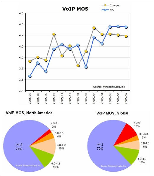 Minacom最新調(diào)研表明,一年來(lái)VoIP電話質(zhì)量和聯(lián)結(jié)速度都超過(guò)傳統(tǒng)標(biāo)準(zhǔn)公共開(kāi)關(guān)電話。電話質(zhì)量得分Mean Opinion Score (MOS)數(shù)據(jù)表明,VoIP得分是4.2,而標(biāo)準(zhǔn)公共開(kāi)關(guān)電話得分3.9。85%的IP電話質(zhì)量和穩(wěn)定性都超過(guò)標(biāo)準(zhǔn)公共開(kāi)關(guān)電話。對(duì)電話聯(lián)結(jié)速度,VoIP的MOS得分是平均8.2秒,傳統(tǒng)電話時(shí)間更長(zhǎng),平均為8.9秒。這里的IP電話服務(wù)指商業(yè)企業(yè)級(jí)應(yīng)用,不是MSN,雅虎通之類免費(fèi)IP電話個(gè)人應(yīng)用。比較而言,北美IP電話質(zhì)量?jī)?yōu)于歐洲。