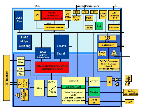 例如,SC14438是一個優(yōu)化了的CMOS芯片,能夠進(jìn)行DECT(1.9GHz)內(nèi)或2.4GHz ISM數(shù)字頻帶手機(jī)內(nèi)需要的所有音頻、信號及數(shù)據(jù)處理。一個ADPCM代碼轉(zhuǎn)換器,一個低功耗的編解碼器(CODEC)及模擬前端被集成于該芯片中,提供麥克風(fēng)與(動態(tài)的)揚(yáng)聲器之間直接的連接。同時還整合了雙工免提操作。SC14438的設(shè)計(jì)適用于任一無線產(chǎn)品設(shè)計(jì)。一個專用的TDMA控制器能夠處理所有的物理層時隙和無線控制。美國國家半導(dǎo)體公司的標(biāo)準(zhǔn)小型RISC CR16B 16位微控制器對所有更高的協(xié)議棧實(shí)行控制。