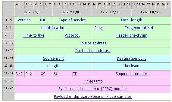 根據(jù)IETF的標(biāo)準(zhǔn)建議,通過IP網(wǎng)絡(luò)傳輸語音信號(hào)樣本需要增加三個(gè)額外的報(bào)頭,每個(gè)報(bào)頭對(duì)應(yīng)一個(gè)網(wǎng)絡(luò)層次,即IP,UDP和RTP [4]。