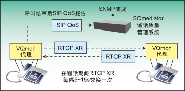 圖2顯示了如何在IP網(wǎng)絡上使用行業(yè)標準覆蓋質(zhì)量管理系統(tǒng)。圖中顯示了嵌入式軟件探測裝置,如IP話機中的行業(yè)標準VQMon代理,它們可實時監(jiān)測通話質(zhì)量。這些代理可生成RTCP
