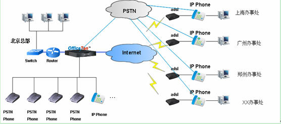 在企業(yè)總部部署一臺OfficeTen,利用OfficeTen的軟交換功能實現(xiàn)企業(yè)內部IP網(wǎng)絡放號、IP Phone的注冊管理和寬帶網(wǎng)絡的接入,并可實現(xiàn)總部分機同時具有外線號碼功能。OfficeTen通過多路FXO口接入PSTN網(wǎng)絡,通過Ethernet口接入Internet,實現(xiàn)語音和數(shù)據(jù)的綜合接入;對內通過Ethernet口連接內部Router和Switch,通過FXS口接入模擬PSTN Phone或通過Ethernet口接入IP Phone。