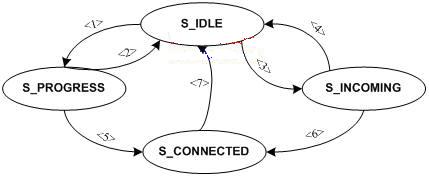 “S_IDLE”狀態(tài)就是我們通常所說的待機狀態(tài)。當(dāng)用戶撥打?qū)Ψ降腟IPURI,協(xié)議棧通過發(fā)送INVITE請求消息,得到臨時響應(yīng)消息,呼叫就處于“S_PROGRESS”,圖中箭頭<1>表示該操作引起的狀態(tài)切換。在“S_PROGRESS”狀態(tài),對方如果拒絕接受呼叫,狀態(tài)又返回“S_IDLE”,如箭頭<2>;當(dāng)對方接受呼叫,就處于連接通話狀態(tài)“S_CONNECTED”,如箭頭<5>。在“S_IDLE”狀態(tài)也可能收到對方的呼叫請求,當(dāng)UA應(yīng)用發(fā)現(xiàn)一個新的呼叫請求,就應(yīng)當(dāng)切換狀態(tài)到“S_INCOMING”,如箭頭<3>;同樣,用戶可以拒絕接受呼叫,狀態(tài)切換回“S_IDLE”,如箭頭<4>;當(dāng)用戶接受呼叫請求,呼叫狀態(tài)就處于“S_CONNECTED”。在“S_CONNECTED”狀態(tài),通話雙方任何一方的結(jié)束通話請求都會導(dǎo)致狀態(tài)返回“S_IDLE”,結(jié)束通話。