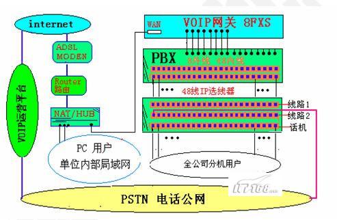 建議采用“EIA2000系列語音網(wǎng)關(guān)”,有單口、2口、4口、8口、16口等設(shè)備,可供選擇。所謂4口,即每設(shè)備有4個通訊接口,可4路同時通話,公司內(nèi)部電話通過集團(tuán)交換機(jī)接入語音網(wǎng)關(guān),且可新增網(wǎng)關(guān)自由擴(kuò)展。端口建議選擇全FXS口接入,每路雙向通話需要占用大約10-12KB,在實(shí)際使用中,每條ADSL線路可供10路同時通話,實(shí)現(xiàn)多人共享使用(在沒有大量數(shù)據(jù)傳輸?shù)那闆r下)。
