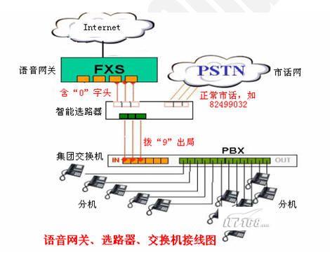 使用網(wǎng)關(guān)電話打國內(nèi)/國際其他普通公話或手機(jī),稱為“點(diǎn)對面模式”。在使用智能路由選線器以后,打出電話時自動根據(jù)首位字頭,例如“0”,判斷選擇市話或者VOIP專線通話,--字頭有“0”,時自動走VOIP網(wǎng)絡(luò)線路,字頭沒有“0”時,選擇走通常的市話線路,完全不改變我們過去使用電話的習(xí)慣!