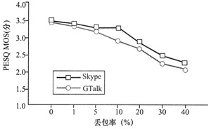 MOS方法評(píng)估了它們語(yǔ)音質(zhì)量的優(yōu)劣。通過(guò)實(shí)驗(yàn)可知:在理想的網(wǎng)絡(luò)狀況下,Skype表現(xiàn)得更好一些(兩者PESQ MOS的分?jǐn)?shù)差別為0.1),總體而言它們的語(yǔ)音質(zhì)量還是較為接近。在網(wǎng)絡(luò)有較長(zhǎng)的時(shí)延時(shí),Skype有不必要的適應(yīng)性。當(dāng)丟包情況發(fā)生時(shí),GTalk沒(méi)有實(shí)施任何機(jī)制來(lái)提高其性能,與此同時(shí),Skype使用數(shù)據(jù)冗余機(jī)制來(lái)對(duì)抗丟包以提高其語(yǔ)音質(zhì)量。在抖動(dòng)情況發(fā)生時(shí),兩者都沒(méi)有很好的機(jī)制來(lái)提高其適應(yīng)性。當(dāng)有較長(zhǎng)的時(shí)延時(shí),PESQ