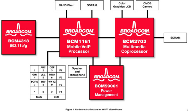 該方法的一個例子如圖1所示。該方案支持接入到本地?zé)o線網(wǎng)絡(luò)的Wi-Fi 接口上的全雙工語音和視頻,它已經(jīng)有了成功的實現(xiàn)案例,并計劃用于一款新型的消費產(chǎn)品設(shè)計。所有高級的呼叫建立和管理、音視頻同步以及應(yīng)用層都在一片BCM1161 VoIP器件上運行。為實現(xiàn)這些功能采用了一片嵌入式通用ARM926E RISC CPU,還有一片嵌入式DSP用于音視頻編解碼和回波消除。利用一個BCM4318E 802.11b/g Wi-Fi無線網(wǎng)絡(luò)接口,BCM1161提供了為實現(xiàn)一個具有成本效益的Wi-Fi手機(jī)的語音所需的全部功能。