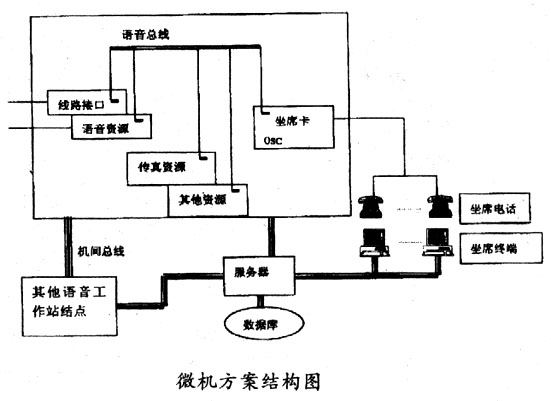 ____這種方案以近幾年發(fā)展迅速的微機語音處理技術(shù)為基礎,其基本思想是在微機平臺上 集成各種功能的語音處理卡,完成通信接口、語音處理、傳真處理、坐席轉(zhuǎn)接等功能,再 結(jié)合外部的計算機網(wǎng)絡實現(xiàn)各種應用系統(tǒng)的需求。