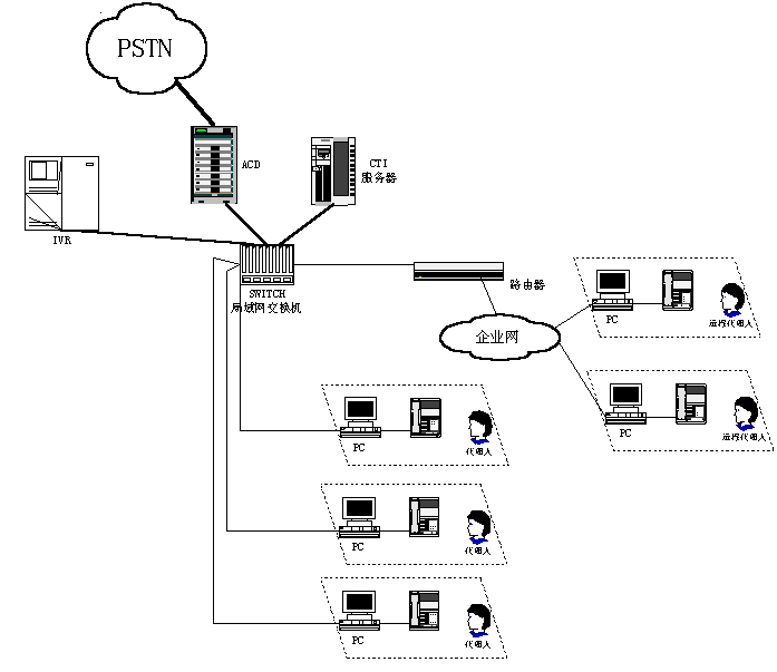 第一代呼叫中心的特點(diǎn):硬件設(shè)備為普通電話機(jī)或小交換機(jī)(排隊(duì)機(jī)),簡單、造價低、功能簡單、自動化程度低,一般僅用于受理用戶投訴、咨詢;適合小企業(yè)或業(yè)務(wù)量小、用戶要求不高的企業(yè)/單位使用。目前,沒有正式設(shè)立呼叫中心的企業(yè)、單位一般采用這種方式。