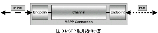 MSPP運(yùn)行在FusionTM環(huán)境下,意即Media Stream Processing Protocol,媒體流處理協(xié)議,它為各種業(yè)務(wù)間的數(shù)據(jù)轉(zhuǎn)換/交互提供了一種可能。它相當(dāng)于一個中間代理(Agent),通過標(biāo)準(zhǔn)的入口/出口終結(jié)點(diǎn)(Entry and Exit Endpoint)和端到端連接(End-End Connection)完成異種網(wǎng)絡(luò)間的格式化數(shù)據(jù)(Formatted Data)傳遞功能,見圖8。MSPP包含兩個基本組件:終結(jié)點(diǎn)(Endpoint)和通道(Channel),異種網(wǎng)絡(luò)間通過這兩種組件構(gòu)成的連接(Connection)完成。