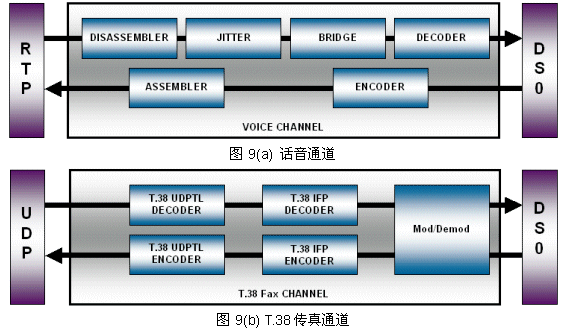 Fusion 提供了標(biāo)準(zhǔn)的MSPP通道類型以支持語聲編解碼和T.38傳真,且可由應(yīng)用程序按需調(diào)用接口函數(shù)創(chuàng)建單工或雙工通道來對數(shù)據(jù)進(jìn)行處理,其中雙工通道實(shí)際上包含兩條單工過濾器鏈組。