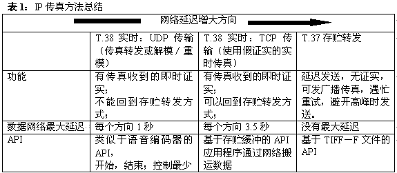 IP傳真方法的一個(gè)總結(jié)顯示于表1之中。通過選擇功能、業(yè)務(wù)需求以及所用網(wǎng)絡(luò)的延遲,就能得出最適合指定應(yīng)用的傳真方法。
