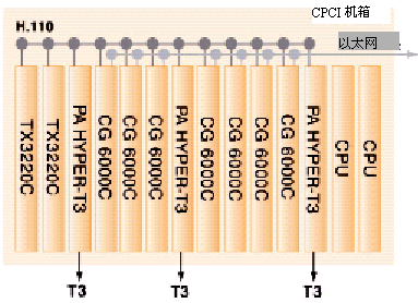 HYPER-T3接入適配板,它用于通過T3線上的1344個端口從PSTN接入語音和傳真媒體。這些媒體會從DS3轉(zhuǎn)換到DS0,然后通過H.110總線發(fā)送給6塊CG6000C中的一塊。CG6000C會壓縮這些語音和傳真媒體,然后用UDP/IP上實(shí)時(shí)協(xié)議(RTP)對它們進(jìn)行打包。再通過板上的兩個以太網(wǎng)接口發(fā)送到一個語音級的IP包網(wǎng)絡(luò)上。請注意,每種板都使用了N+1板卡級的冗余備份。