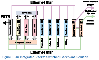 PICMG 2.16兼容平臺上,這種解決方案充分利用了有背板結(jié)構(gòu)的以太網(wǎng)交換的集成特性,以提供任意插槽(節(jié)點)和以太網(wǎng)交換插槽兩者之間的物理連接。有著特定的串行卡,可能是語音處理卡,SDSL集中器,或一塊VoIP網(wǎng)關(guān)卡,通過使用在這些卡上的CompactPCI控制平面和H.110數(shù)據(jù)平面得以實現(xiàn)。(為了清晰,額外的不被使用的CompactPCI總線部分,和相關(guān)的H.110總線部分,在圖6中忽略)