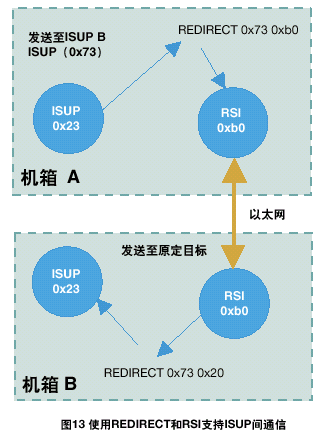 例如,一個雙ISUP系統(tǒng)應(yīng)該由兩個ISUP部分組成,每部分缺省module_id都為0x23。A方ISUP的配置數(shù)據(jù)表示另一個ISUP部分的module_id為0x73;因此,在A方將會有一個重定向的動作來對經(jīng)過RSI發(fā)送往0x73的任何訊息重新定向。在B方,應(yīng)該有一個REDIRECT語句將B方RSI所接收的所有目標(biāo)為0x73的訊息路由到本地ISUP,標(biāo)識為0x23。具體情況如圖13所示。