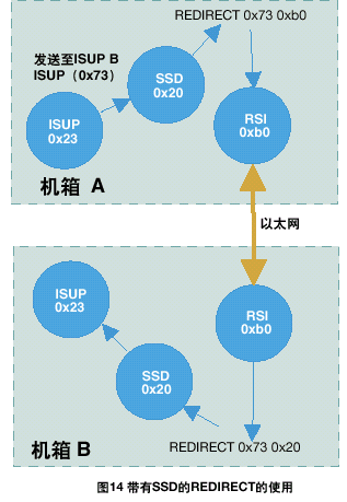 運(yùn)行在信令卡上的協(xié)議模塊,接收端(對方)的REDIRECT語句應(yīng)該通過ssd或ssds驅(qū)動(通常情況下module_id為0x20)來對訊息進(jìn)行重定向,如圖14所示。