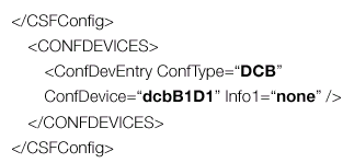它由三個(gè)要素組成――CSFConfig、CONFDEVICES和ConfDevEntry。前兩個(gè)要素只用于為解析和數(shù)據(jù)收集過(guò)程中的每個(gè)ConfDevEntry提供環(huán)境。CONFDEVICES要素用于確定值所駐留的STL容器,容器(CONFDEVICELIST)的每個(gè)節(jié)點(diǎn)都包含一個(gè)對(duì)象,對(duì)象的成員變量名稱類似于XML文件中的屬性名稱――如ConfType、ConfDevice、Info1等等。成員變量的值將為屬性的值――DCB、dcbB1D1、及空值。