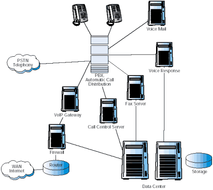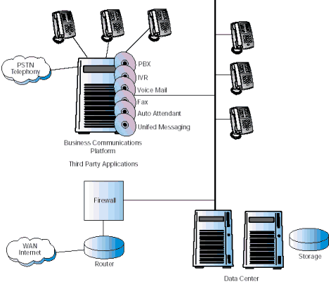 圖1描述了當(dāng)前一個(gè)典型的復(fù)雜的企業(yè)通信系統(tǒng)配置。連接到PSTN的主要部分PBX/KTS,仍然是系統(tǒng)的核心,提供了交換和自動(dòng)呼叫分配的功能。一系列增加的應(yīng)用通過附屬服務(wù)器連接到PBX/KTS上。很多附屬服務(wù)器也連到數(shù)據(jù)中心上,因?yàn)樗鼈冃枰L問企業(yè)的數(shù)據(jù)。 使現(xiàn)有情況變得更為復(fù)雜的是,Internet正在變?yōu)椴豢扇鄙俚纳虅?wù)工具,各公司紛紛安裝VoIP以降低網(wǎng)絡(luò)成本,滿足多媒體通信的需要。這些服務(wù)由企業(yè)防火墻后的網(wǎng)關(guān)提供,這個(gè)網(wǎng)關(guān)也是連接到PBX/KTS上的。