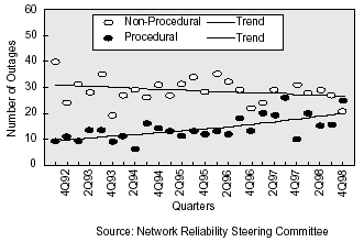 根據(jù)來自網(wǎng)絡(luò)可靠性指導(dǎo)委員會(huì)(NRSC)的研究,對(duì)于33%報(bào)告的業(yè)務(wù)中斷,程序出錯(cuò)是根本原因。程序中斷的頻率有上升的趨勢,正如在右面圖中顯示的那樣。