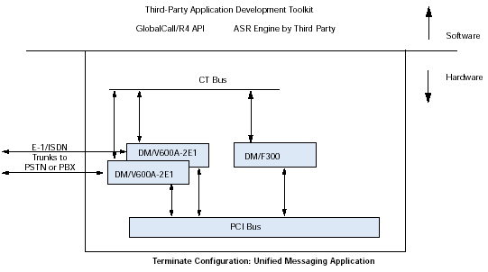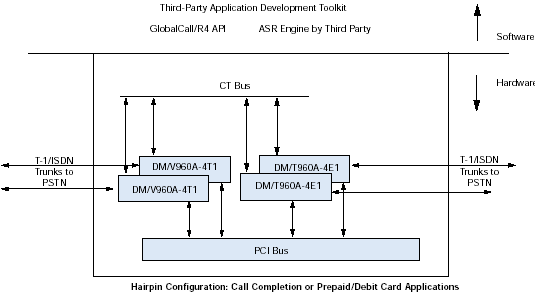 通過訪問計算機電話(CT)工業(yè)標準的ECTF H.100/H.110 CT Bus,利用DM/V-A多功能資源系列板卡,應用程序可以具備交換能力以及擴展到其他技術的能力,諸如網(wǎng)絡接口(DM/T或者DM/N系列),ATM連接,SS7,以及IP電話。