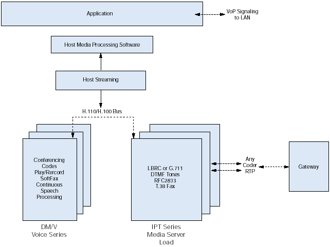 如圖2所示,IPT系列板卡可以通過H.110總線連接到任何一個高密度的Dialogic Dialogic DM/V語音系列媒體處理板卡上。開發(fā)商通過組合IPT系列和DM/V板卡,便可以分發(fā)他們的解決方案,包括語音處理、傳真、講話以及會議功能,這套解決方案可以使每個系統(tǒng)可以從數(shù)以百計的端口升級到數(shù)以千計的端口。開發(fā)商也可以選擇使用IPT系列板卡作為高密度接口板卡,并連接到PCI總線使其可以訪問在主機處理器上執(zhí)行的媒體處理功能。
