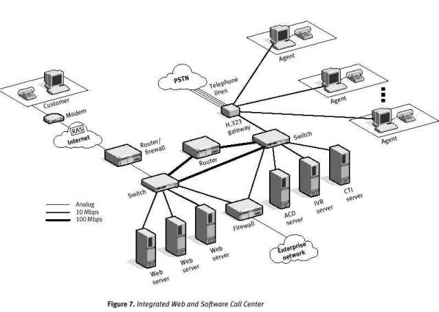 向基于軟件的呼叫中心模型遷移的第一步:通過使呼叫中心具有Web能力,將來(lái)自因特網(wǎng)的呼叫接入到現(xiàn)有呼叫中心中。圖5展示了H.323網(wǎng)關(guān)如何轉(zhuǎn)換VoIP呼叫到現(xiàn)有自動(dòng)呼叫分配器(ACD)支持的傳統(tǒng)電話呼叫。這一簡(jiǎn)單步驟,使公司能夠通過基于因特網(wǎng)的電話連接客戶。然而,在客戶所見到的Web頁(yè)面和業(yè)務(wù)代表的Web內(nèi)容及CTI數(shù)據(jù)之間,通常既沒有邏輯連接,也沒有物理連接。(CTI數(shù)據(jù)的獲得可能會(huì)通過在客戶的瀏覽器上下載一個(gè)代理或一個(gè)JAVA小程序?qū)崿F(xiàn),通過它發(fā)出客戶的位置等相關(guān)數(shù)據(jù))。因此在大多數(shù)情況下,客戶和業(yè)務(wù)代表在購(gòu)買或支持過程中通過交談而解決問題。